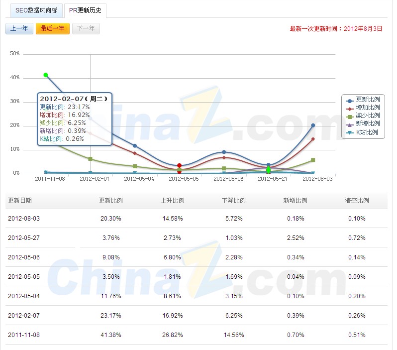 谷歌PR值一直以来都是我们判断网站价值的一个非常重要的标准,虽然有些人说谷歌PR可以刷,不一定准确,但是这样的标准太少了,难的有一个可以参考的,所以交换友情链接也好,买卖网站也好、代发文章也好,都要求PR达到一定的值。根据大量统计分析,谷歌PR如无意外将在11月初更新,以下图来自站长之家的数据风向标。